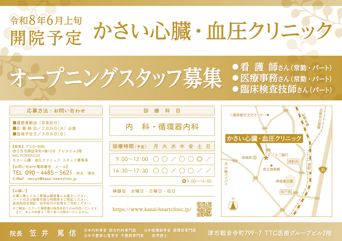 この度、三重県津市で心臓・血圧クリニックを開院させていただきます。院長の笠井 篤信と申します。